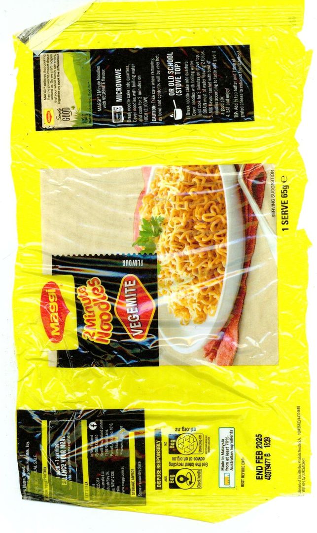 Maggi Two Minute Vegemite Description These are novelty noodles from the well known swiss brand Maggi. They are vegemite flavoured. Vegemite is an edible Australian waste product. I got these for AUD$2.00 Photos Thoughts They tasted like cheap soy sauce noodles and smelt like vegemite. The Spice-O-meter ❓ 🌶 0% The Value-O-meter ❓ 🤑 25% Comment