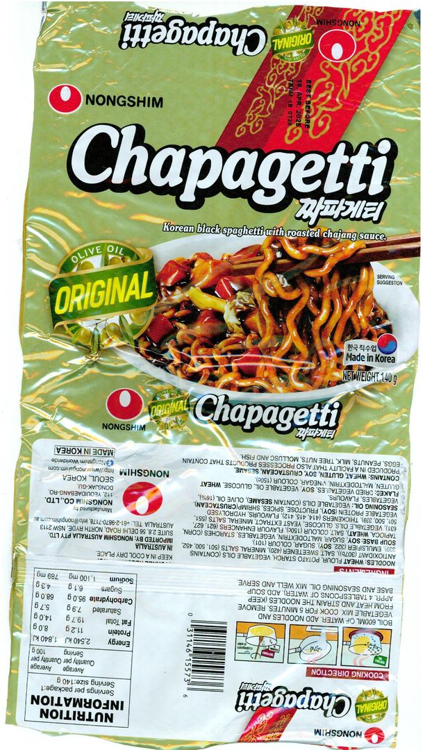 These are black-bean based noodles made by Nongshim sold as Chapagetti. The packet describes them as "Korean black spaghetti with roast chajang sauce" but they are just jjajang noodles. I have reviewed a few black-bean based noodles in the past.